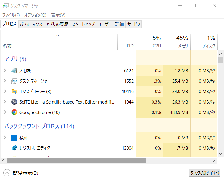 タスクバーにも表示されませんが、タスクマネージャーで確認するとレジストリエディタが実行されているのが確認できます。